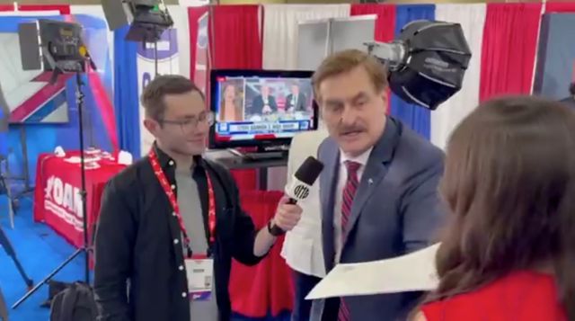 In chaotic on-air moment, the MyPillow founder tried to dodge the delivery before tossing the documents aside.